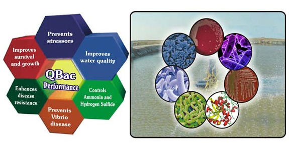 QBac competes with Vibrio and other opportunistic pathogenic bacterial species and controls their propagation in aquaculture ponds.