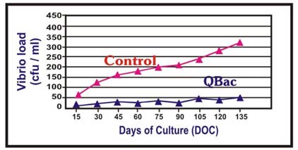The loads of Vibrio sp. were effectively controlled by QBac (Fig. 2) in shrimp culture system which indicates the increased survival and growth (Fig. 3&4).