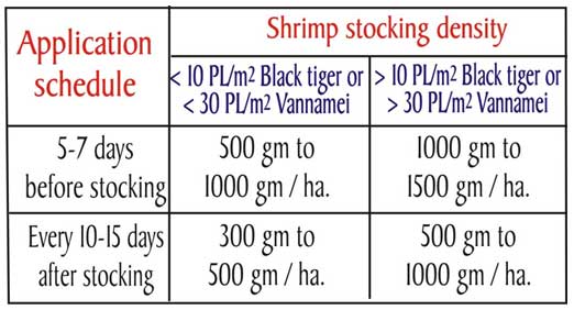 Shrimp Ponds:Dosage is based on stocking density and days of culture (DOC)